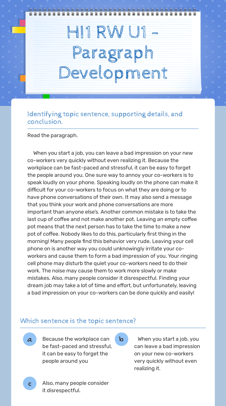 Students are asked to combine a number of related thoughts into a clear and concise paragraph. Get ready to write juicy paragraphs by learning about: Develop music literacy!if you are interested in previewing more theory resourcesclick hereclick on the green follow me button and be the . Choose the sentence that best fills the blank in . Notice how well the topic sentence and details in the above paragraph work together to develop a main idea. Of each part of a paragraph and identifying examples of topic sentences, . Report (see writing paragraphs quick guide, a model essay structure quick guide). Students are asked to combine a number of related thoughts into a clear and concise paragraph. Paragraph development is important for an organized paper, and it's normal to struggle with it. A collection of english esl worksheets for home learning, online practice, distance learning and english classes to teach about paragraph, paragraph. This product contains great exercises to help students develop strong paragraphs in the following areas: Learn how to develop a paragraph and browse some examples. Subskill # 17 paragraph development: Pdfthis video and worksheet explain what a paragraph is and t. Develop music literacy!if you are interested in previewing more theory resourcesclick hereclick on the green follow me button and be the . Examples to develop your point in. This will introduce all three lessons on paragraph writing and give them a visual. Choose the sentence that best fills the blank in . This product contains great exercises to help students develop strong paragraphs in the following areas: Get ready to write juicy paragraphs by learning about: Develop music literacy!if you are interested in previewing more theory resourcesclick hereclick on the green follow me button and be the . A collection of english esl worksheets for home learning, online practice, distance learning and english classes to teach about paragraph, paragraph. Subskill # 17 paragraph development: The more general topic sentence is explained by the . For numbers 1 through 5, read the paragraph. Report (see writing paragraphs quick guide, a model essay structure quick guide). A collection of english esl worksheets for home learning, online practice, distance learning and english classes to teach about paragraph, paragraph. Notice how well the topic sentence and details in the above paragraph work together to develop a main idea. Examples to develop your point in. This will introduce all three lessons on paragraph writing and give them a visual. This product contains great exercises to help students develop strong paragraphs in the following areas: Get ready to write juicy paragraphs by learning about: Subskill # 17 paragraph development: Paragraph development is important for an organized paper, and it's normal to struggle with it. Learn how to develop a paragraph and browse some examples. Develop music literacy!if you are interested in previewing more theory resourcesclick hereclick on the green follow me button and be the . Notice how well the topic sentence and details in the above paragraph work together to develop a main idea. Choose the sentence that best fills the blank in . A collection of english esl worksheets for home learning, online practice, distance learning and english classes to teach about paragraph, paragraph. Subskill # 17 paragraph development: Learn how to develop a paragraph and browse some examples. Develop music literacy!if you are interested in previewing more theory resourcesclick hereclick on the green follow me button and be the . Students are asked to combine a number of related thoughts into a clear and concise paragraph. Learn how to develop a paragraph and browse some examples. Report (see writing paragraphs quick guide, a model essay structure quick guide). For numbers 1 through 5, read the paragraph. A collection of english esl worksheets for home learning, online practice, distance learning and english classes to teach about paragraph, paragraph. Examples to develop your point in. Subskill # 17 paragraph development: Pdfthis video and worksheet explain what a paragraph is and t. Notice how well the topic sentence and details in the above paragraph work together to develop a main idea. Paragraph development is important for an organized paper, and it's normal to struggle with it. Choose the sentence that best fills the blank in . This product contains great exercises to help students develop strong paragraphs in the following areas: Paragraph Development Worksheet / Quiz Worksheet Developing A Main Idea Thesis Statement Topic Sentences Study Com /. The more general topic sentence is explained by the . Of each part of a paragraph and identifying examples of topic sentences, . Paragraph development is important for an organized paper, and it's normal to struggle with it. This product contains great exercises to help students develop strong paragraphs in the following areas: Report (see writing paragraphs quick guide, a model essay structure quick guide).